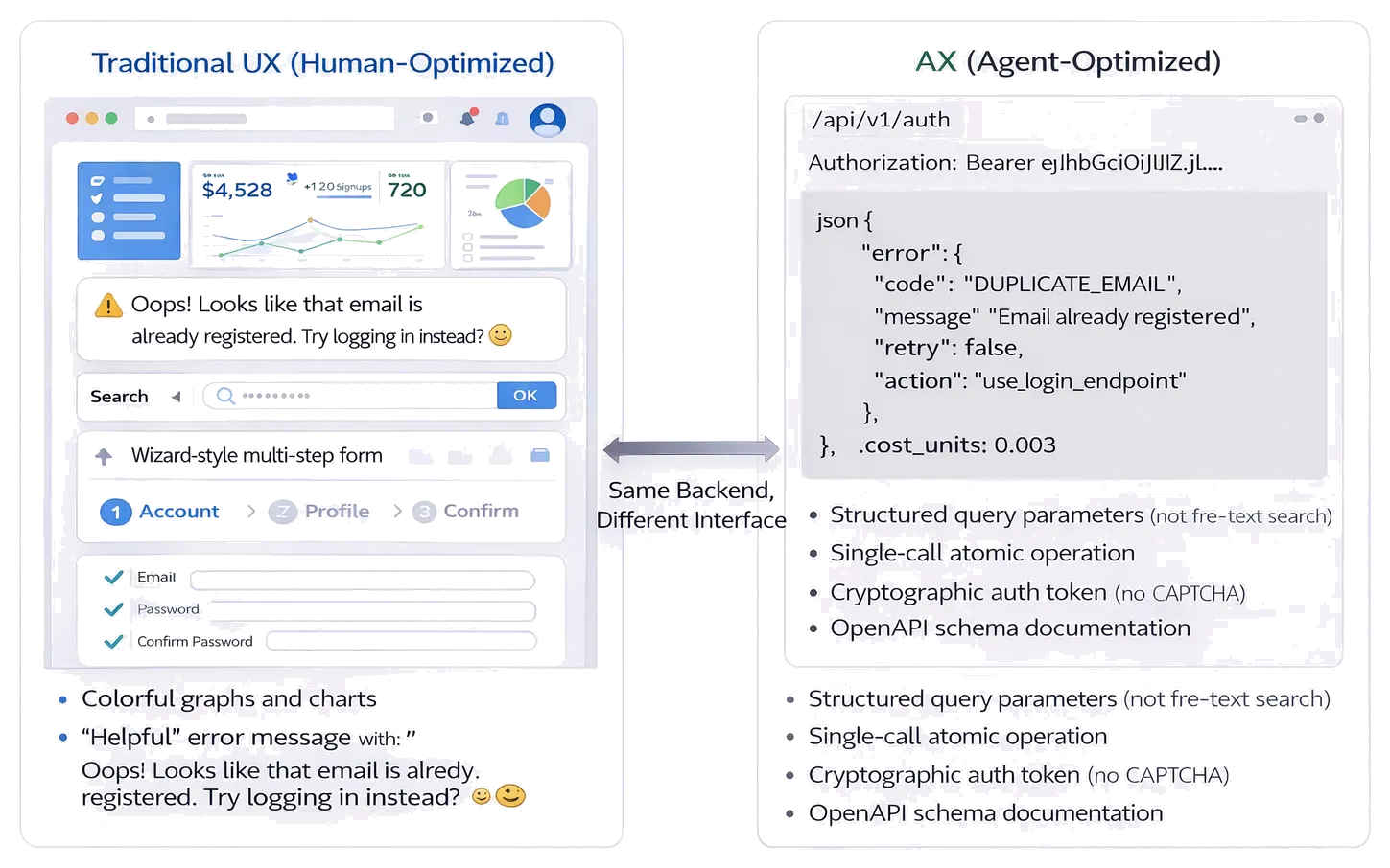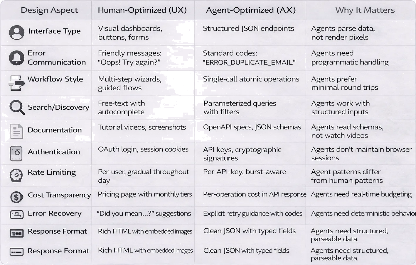 APIs must serve both human and agent consumers. Agent-optimized design prioritizes: