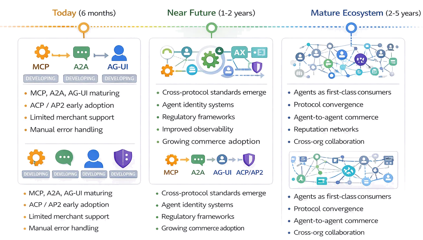 Protocol ecosystems will mature, commerce adoption will grow, and agent-optimized infrastructure will become standard. The teams building with these protocols today are establishing competitive advantages for tomorrow.
