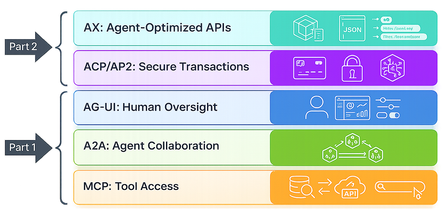 The MCP-A2A-AG-UI stack handles internal agent coordination, tool access, delegation, and oversight. As agents gain autonomy, a new challenge emerges: conducting secure transactions on behalf of users.