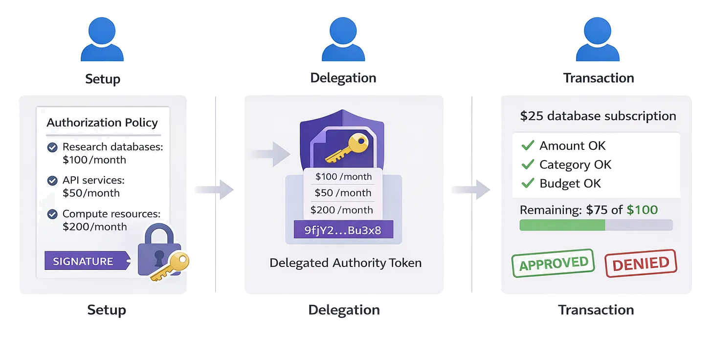 User defines authorization policies: “Agent can spend up to $100/month on research databases”