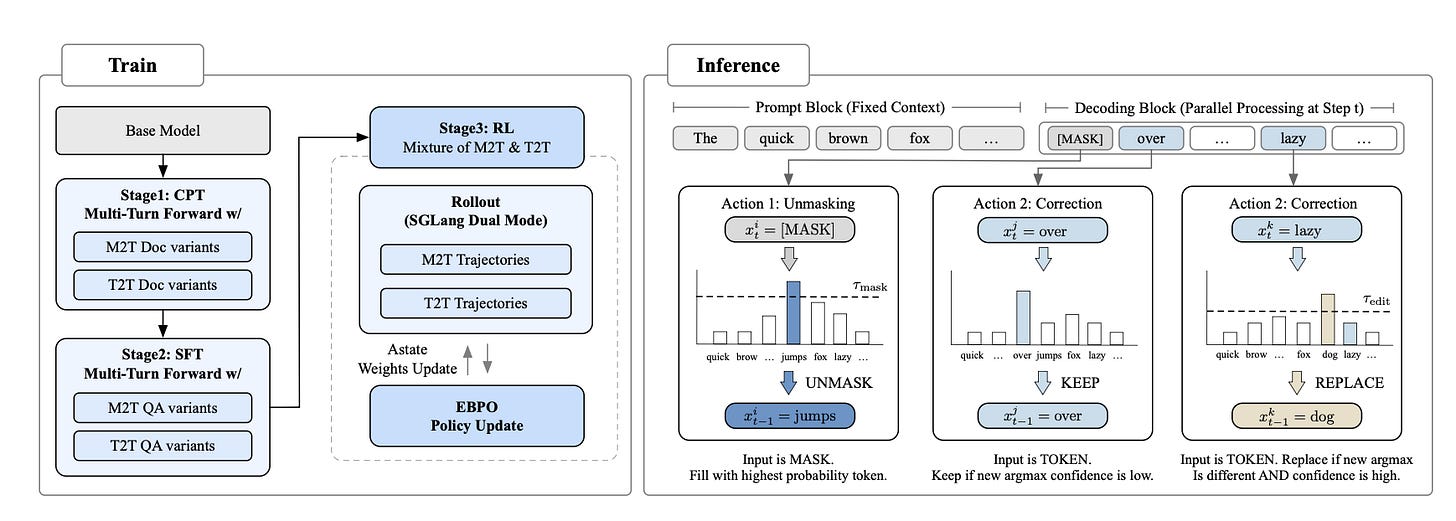 Stage 1 — Continual Pre-Training (CPT): The model trains on two objectives simultaneously. The standard predict masked tokens task (M2T) and a new objective that introduces random noise into existing tokens and asks the model to correct them (T2T). This builds both drafting and error-correction instincts from the ground up.