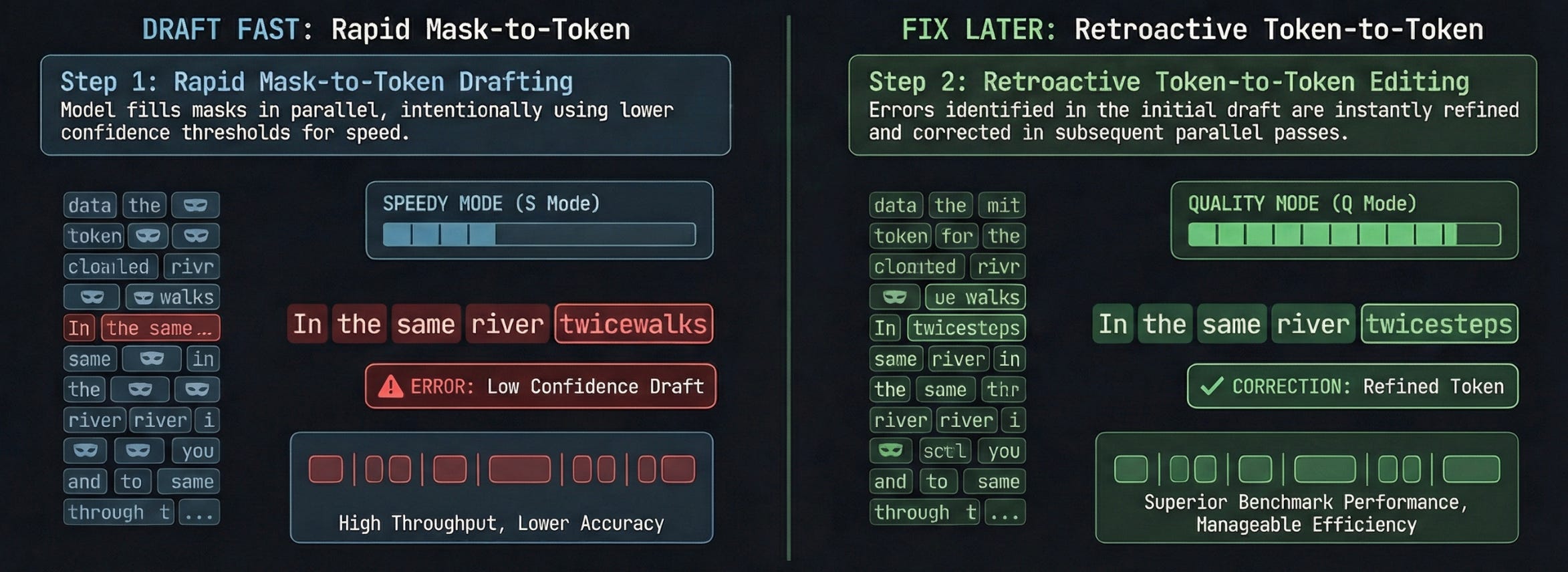 Speedy Mode (S Mode) sets the mask threshold aggressively low. The model fills in tokens fast even when uncertain, because it can return and fix mistakes. Draft fast, fix later.