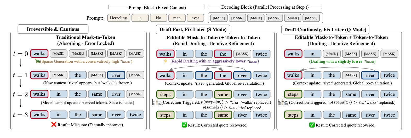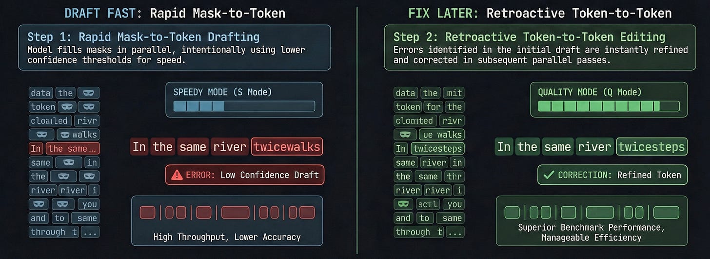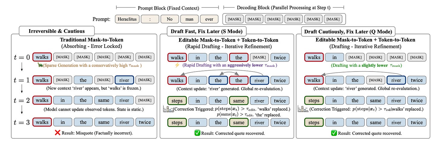 The catch? When you fill in many words at once, some clash. And in previous diffusion models, once a token was placed, it was frozen forever. Errors locked in. No way back.