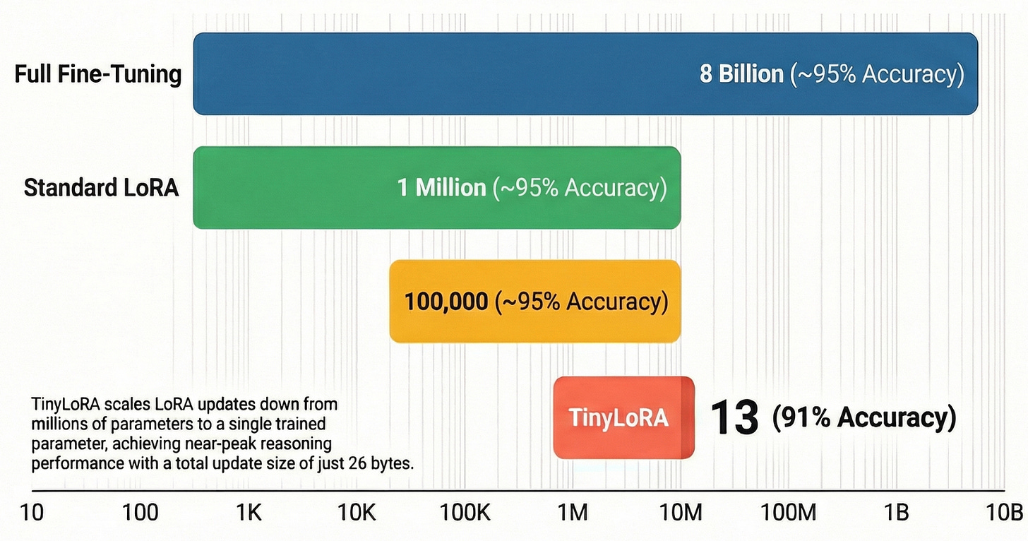 TinyLoRA goes further. Instead of training a full low-rank matrix, it trains a tiny vector that gets projected through a fixed random tensor to produce the weight update. With aggressive weight sharing across all transformer modules; attention and feedforward layers alike - the total trainable parameters can drop to single digits.