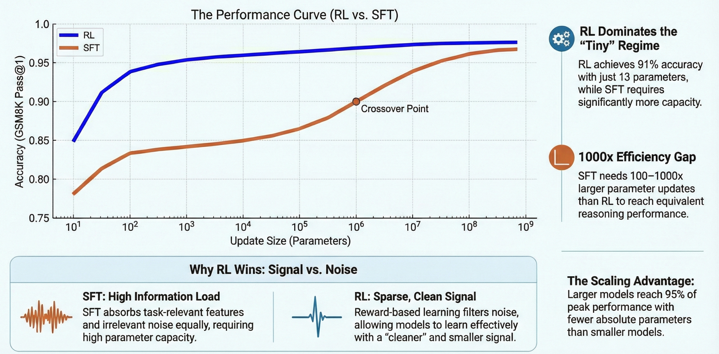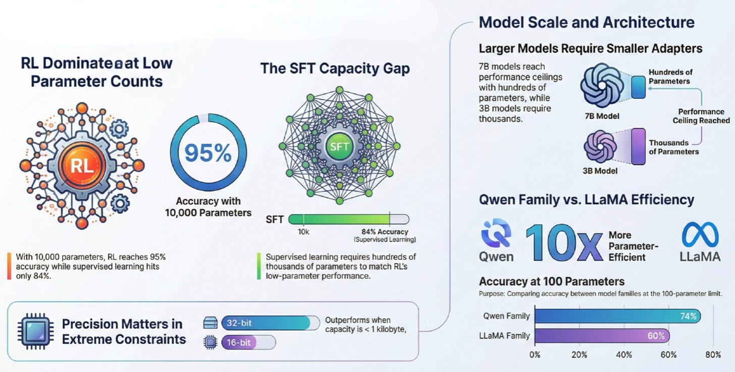 This explains why RL thrives in the ultra-low-parameter regime while supervised learning struggles. RL doesn’t need to memorize solution patterns; it just needs to learn which directions in parameter space increase the probability of reward. That’s a fundamentally simpler learning problem.