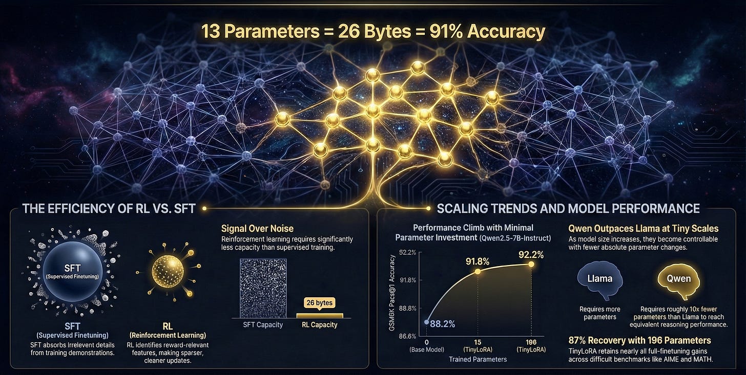 The paper Learning to Reason in 13 Parameters by Morris et al. introduces TinyLoRA, a method that pushes parameter-efficient fine-tuning to its theoretical limits. More importantly, it reveals a fundamental difference in how supervised learning and reinforcement learning work when teaching models to reason.